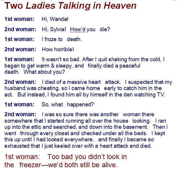 The Minister smiles, puts a brotherly hand on Bob’s shoulder and says…You better hurry home now. My wife died a year ago”